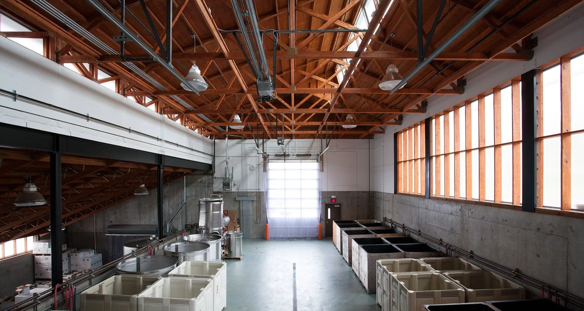 NEWBERG, OR - This wine facility makes use of a steeply sloping site with a dramatic, multi-level structure of four levels representing the winemaking process: a raised crush balcony, a lower fermentation level, a blending level and a barrel and bottling level. Barrels are stored in subterranean vaults, while the tasting room is day-lit. Translucent panels covering the work areas reduce the need for artificial lighting. Seventy percent of the rainwater is drained off the lower roof through a scupper into a detention pond, and used on the site. Other sustainable features include concrete with high levels of fly-ash, certified cedar, and corrugated metal siding.