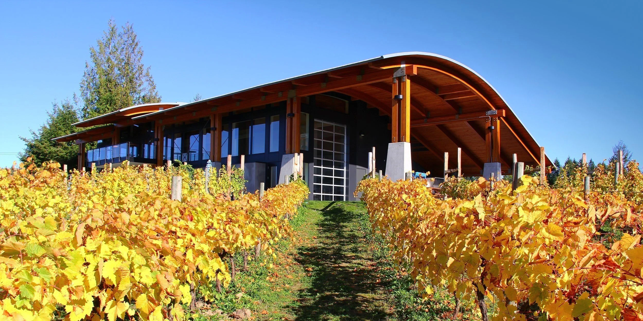 DUNCAN, BC - Elements of the Blue Grouse master plan include roads, trails, vineyard expansion, ponds, a winery, vineyard barn, guest cottages, and manor house. The winery takes cues from a grouse’s form, which separates this structure from the covey of wineries in Cowichan Valley on Vancouver Island. The curve of the grouse’s head and neck are design inspirations for the roof. The colors of the construction materials are of the bird’s feathers and the visually, 22-foot tall blue entry door is the color of a tail feather flashing in the sunlight. The design employs sustainable strategies including: reuse of an existing structure; water recycling; controlled solar gain for summer cooling and winter heating; daylighting elements cutting approximately 66 percent of electricity use; underground barrel and sparkling wine storage and ground source heat pumps.